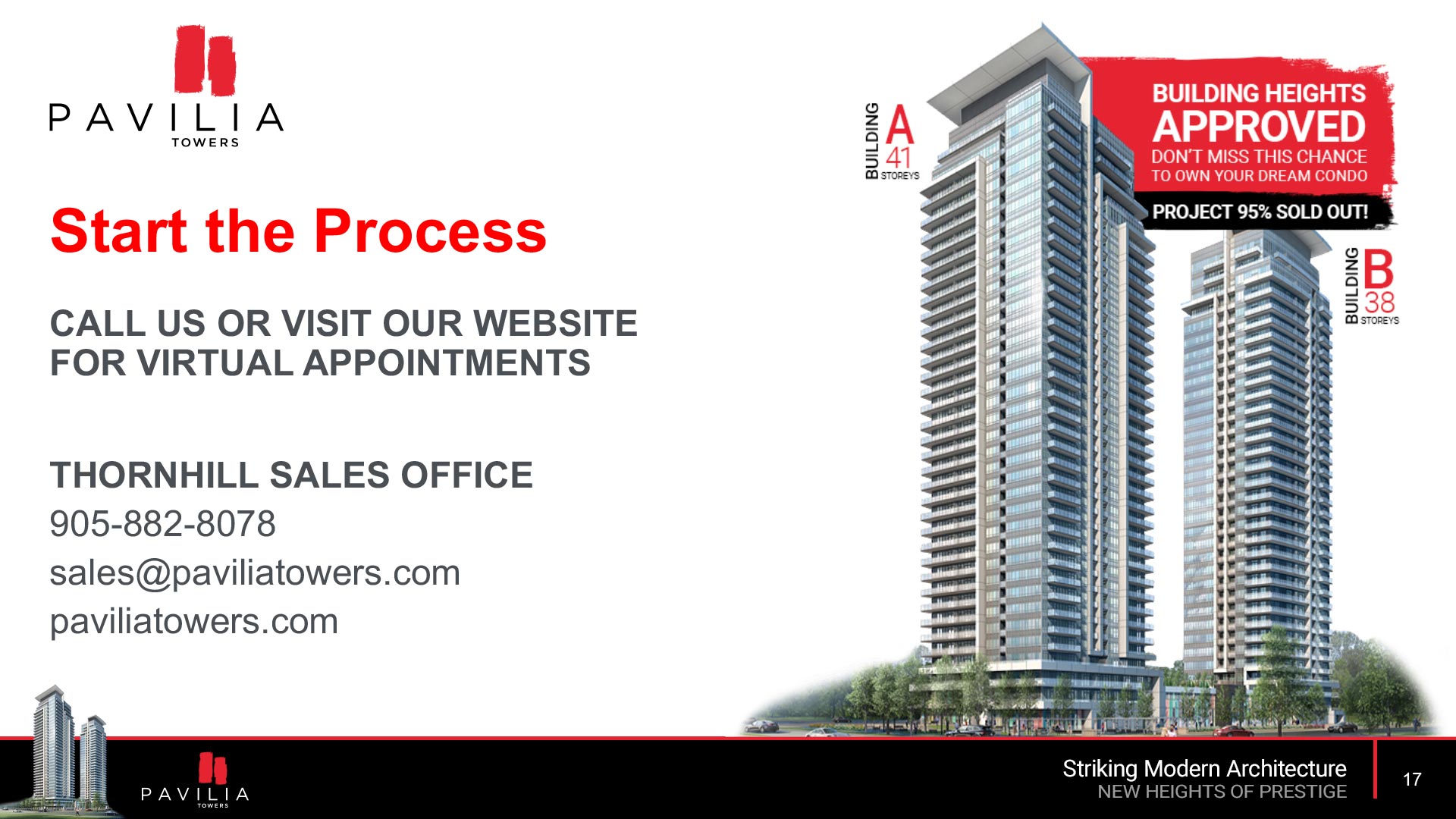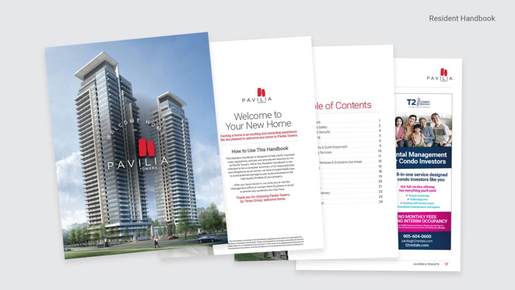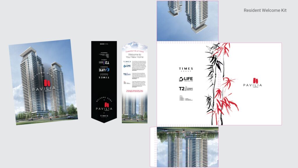 For Pavilia Towers, a condominium project in Thornhill, I have developed a wide array of marketing materials throughout its lifecycle. Acting as a one-man agency, I played a crucial role from the sales phase to the final handover of the building. My responsibilities included creating print materials, presentations, project videos, exterior signage, elevator touchscreens and interior wayfinding. Remarkably, I wrote the script, filmed most of the footage, and provided the narration for the project video, showcasing my multifaceted skills and dedication to the project.