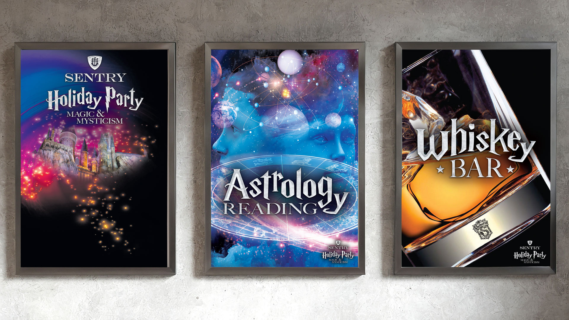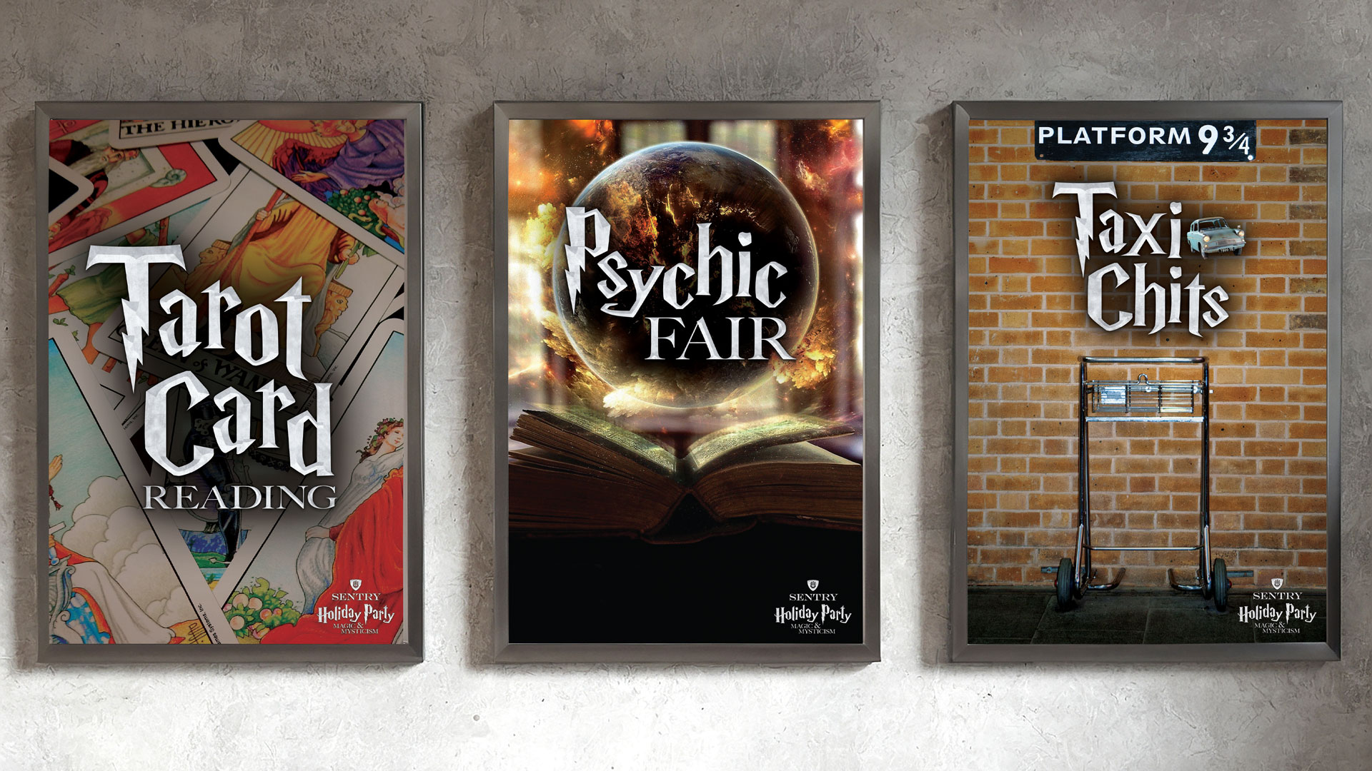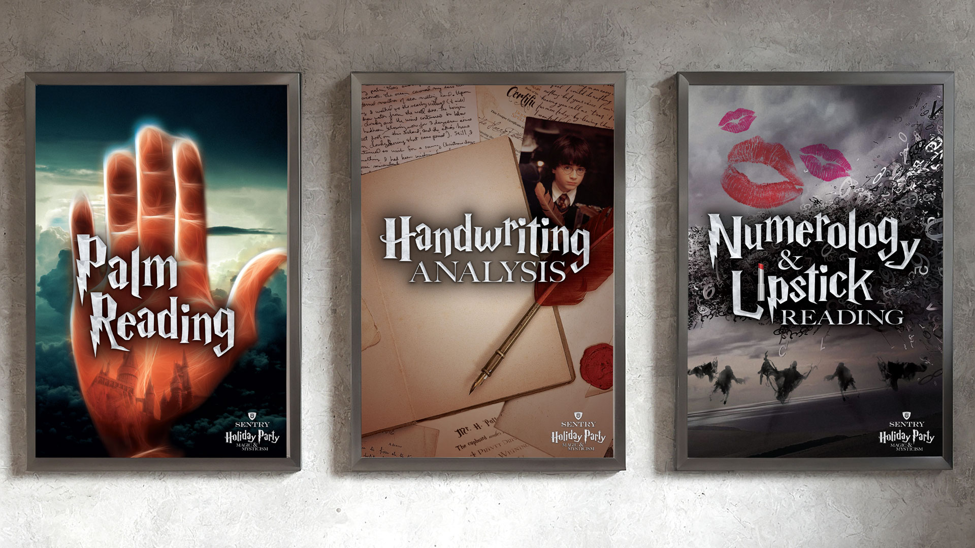 For Sentry Investments’ Harry Potter themed holiday party, I took on the role of lead designer. My responsibilities included creating immersive motion backdrop video graphics, designing posters for themed stations such as palm reading and astrology, and crafting enchanting invitations. The goal was to transport guests into the magical world of Harry Potter, ensuring an unforgettable experience.